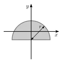Un semicírculo macizo como antes pero respecto a un eje colineal a la base | ![]() | : Esto es una consecuencia del teorema de ejes paralelos de Steiner y del hecho que la distancia entre los dos ejes es .[2] | ||
