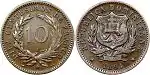 10 Centésimos | 1891 | Cobre | Denominación y dos ramos de laureles | Escudo dominicano año de emisión y la inscripción República Dominicana | ![]() | |||