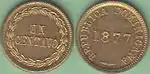 2½ centavos | 1877 | Cuproníquel | Cruz entre ramo de palma y laurel | REPUBLICA DOMINICANA·2½ CENTAVOS·1877 | ![]() | |||