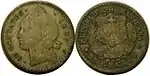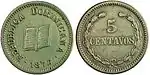5 centavos | 1877 | Cuproníquel | 17.9 mm | 2.5 g | Constitución bordeada por la inscripción REPUBLICA DOMINICANA 1877 | Denominación entre ramos de palma | ![]() | |