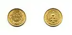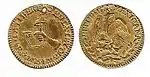 33,84 | ? | Au | Escudo de armas mexicano y nombre oficial del país: REPUBLICA MEXICANA. | Gorro frigio sobre rayos solares arriba de la balanza de Ley. | ? | 1870-1905. | Álamos, Culiacán, Chihuahua, Durango, Guanajuato, Hermosillo, México y Zacatecas. | |