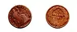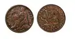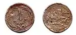 ? | 20,00 | Cu | "1/8" y "PAZCUARO". | Busto a izquierdas.[7] | ? | Sin fecha. | Pátzcuaro. | Michoacán. | ![]() |