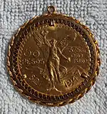 16,6666 | 27,50 | 90,00 % Au, 10,00 % Cu | "ESTADOS UNIDOS MEXICANOS" y escudo. | "VEINTE PESOS", ceca, año de acuñación y Piedra del Sol. | ? | 1917-1921, 1959.[28] | México. | |