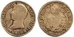 3,3 | 20 | 90,27 % Ag, 9,73 % Cu | "PROCLAMADO EN QUETSALT. A. DE. 1822.", laureles y escudo. | "AGUSTIN I. EMPERAD. DE MEXICO." y busto. | Estriado. | 1822. | Quetzaltenango. | Guatemala. | ![]() |