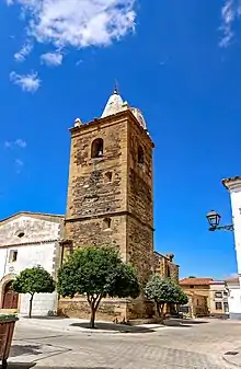 - Iglesia parroquial de Nuestra Señora del Olmo, se empezó a edificar en 1495, trabajaron los maestros canteros de la orden de Alcántara, logrando una de las mejores muestras del gótico tardío en Extremadura, aunque ya se deja ver las nuevas corrientes en arquitectura. Se acabó de construir en 1557. En su interior guarda un magnífico retablo renacentista y un órgano barroco que precisa restauración. El conjunto ha sido declarado Monumento Histórico-Artístico.[15]