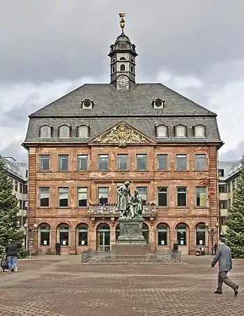 con el Monumento a los Hermanos Grimm (Denkmal der Brüder Grimm in Hanau) situado delante de él.