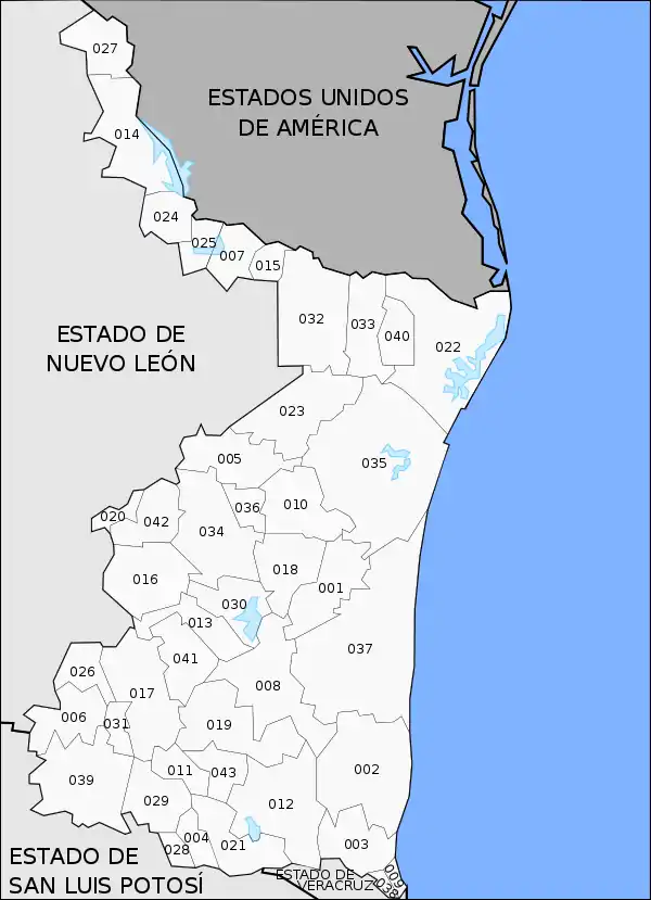 Tamaulipas es una de las 32 entidades federativas de México, y se encuentra dividido en 43 municipios.[1] El municipio, como lo define la Constitución Política Mexicana en su artículo 115, es la base de la división territorial de cada entidad, así como de su organización política y administrativa.[2] Cada municipio cuenta con su propia cabecera municipal, que sirve como sede del poder del gobierno municipal, además de que a menudo se trata de la localidad más importante dentro del mismo.