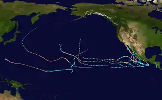 Dentro de la cuenca del Pacífico Oriental, el nombre de los ciclones tropicales comenzó en 1960, con cuatro conjuntos de nombres femeninos inicialmente diseñados para ser utilizados consecutivamente antes de ser repetidos.[5] En 1965, después de haber utilizado dos listas de nombres, se decidió volver al principio de la segunda lista y comenzar a reciclar los conjuntos de nombres anualmente.[6] En 1977, después de las protestas de varios grupos de defensa de los derechos de las mujeres, NOAA tomó la decisión de ceder el control sobre la selección del nombre al permitir que un comité regional de la Organización Meteorológica Mundial seleccionara nuevos conjuntos de nombres.[7] La Organización Meteorológica Mundial seleccionó seis listas de nombres que contenían nombres masculinos y se rotaban cada seis años. También decidieron que las nuevas listas de nombres de huracanes comenzarían a utilizarse en 1978, que era un año antes que el Océano Atlántico.[8] Desde 1978 se han utilizado las mismas listas de nombres, con los nombres de los ciclones tropicales importantes eliminados de las listas y reemplazados por nuevos nombres.