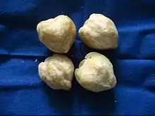 Nuez de India o Calumbán | Aleurites moluccanus | Semilla de Drupa | El fruto drupáceo es semejante a la nuez común, con piel de color verde, y contiene de 1 a 2 semillas globosas, las nueces, de cáscara dura y un segundo tegumento o piel semejante a las avellanas, con alto contenido en aceite. Las nueces se consumen en platos de cocina suroriental y el aceite es un buen combustible. | ![]() Nueces de India sin cáscara y peladas, listas para comer. |
