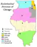 Cada diócesis está dirigida por un obispo. En los Estados Unidos, todos los arzobispos (excepto uno) son metropolitanos. Cada color representa uno de las 32 Provincias Eclesiásticas Metropolitanas de la Iglesia Latina.