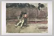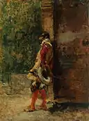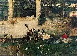 De temática costumbrista, la composición, la técnica y el color consiguen una pintura con la impresión de ser un boceto, la soltura de la aplicación de las pinceladas, retienen la realidad sin dedicarse en exceso al detalle, se puede ver la definición de las sombras y las luces con lo que consigue reproducir el efecto de deslumbramiento óptico por efecto del sol. En definitiva es la manera espontánea de presentar una pintura colorista al aire libre, un largo proceso de estudio de la época que se estaba llevando a cabo en las escuelas pictóricas europeas.[28] |