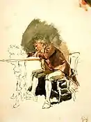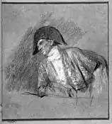 Realizado en Granada presenta claras influencias de Velázquez, la figura se encuentra sobre un fondo neutro tratado con libertad y riqueza pictórica, el rostro recibe la luz procedente de la parte izquierda y sus toques de pintura son precisos, exagerando la punta de nariz con una tonalidad rojiza y un largo mostacho que imita el motivo representado por Velázquez en el Marte del museo del Prado. La temática es una alegoría a Baco con el atributo clásico de la corona de pámpanos en la cabeza, esta iconografía se encuentra empleada entre diversos pintores de la escuela madrileña entre ellos Eugenio Lucas y Leonardo Alenza.[43] |