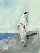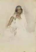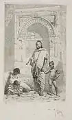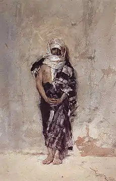 La fuente de entrada al museo fue en 1933 procedente de la colección D.P.Botkin.[14] Esta imagen forma parte de la galería de personajes árabes, donde pretendía, como su amigo el pintor francés Georges Clairin, buscar la realidad magrebí. Se apoyó en las exóticas vestiduras, los claros matices, la gradación de tonos para destacar la luz y la utilización de la espátula para el efecto final.[15] |