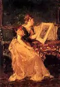 En la parte inferior izquierda de la pintura hay una inscripción: «Recordando vuestra fantasía de Fausto» dedicado al músico Juan Bautista Pujol. La pintura representa el momento en el que el músico está interpretando al piano la obra la Gran fantasía de Fausto inspirada en la ópera Fausto de Charles Gounod en una velada que tuvo lugar en casa del pintor Francisco Sans Cabot. La escena se divide en dos partes, la terrenal o parte inferior donde se encuentra el músico tocando al piano y junto a él los pintores Lorenzo Casanova Ruiz y Agapito Francés, toda esta superficie está tratada con el máximo detalle, tanto de personajes como de los objetos que la componen y en colores oscuros. En la parte superior y empleando una diagonal de colores mucho más luminosos, aparece la parte de fantasía, donde entre unas nubes asoman Mefistófeles vestido de rojo cortejando a Marta para distraer la atención de Margarita, que se adivina sutilmente al fondo junto a Fausto.[34] La pintura perteneció al músico Juan Bautista Pujol desde 1866 hasta su venta a Ramón Errazu en 1875, finalmente fue legada al Museo del Prado en 1904.[35] |