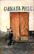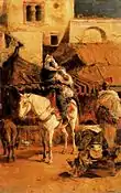 Colección particular | Esta pintura pintada en Roma pero con apuntes realizados en Tánger en 1862, muestra la influencia del orientalismo francés en especial de Delacroix y siguiendo la norma dictada por este artista: «...la luz, a veces atenúa los tonos, otras los exalta, los modifica constantemente con el juego de sus reflejos cambiantes». Técnica muy bien aprendida por Fortuny, que representa una escena costumbrista seguramente en el zoco de Tánger y que muestra en ella todo un inventario de objetos y su fascinación por la civilización marroquí.[37] |