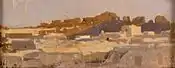 Paisaje realizado a su regreso del segundo viaje a Marruecos pensionado por la Diputación Provincial de Barcelona. A pesar de que en un catálogo de 1875 está considerada como una vista de los alrededores de Roma, el estudio posterior de la orografía de esta pintura coincide con algunos de los apuntes realizados «in situ», así como se advierte en los personajes diminutos que aparecen en el paisaje que están vestidos con chilabas. En esta obra aparece por primera vez unos ligeros toques de colores rojo, verde, azul y anaranjado, que podrían ser precursores de una técnica empleada más adelante por el pintor para conseguir más volumen y contraste de luz.[20] |