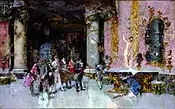 Biblioteca Museo Víctor Balaguer, Vilanova i la Geltrú | Durante la estancia en Madrid con motivo de su matrimonio, el pintor realizó varias telas de diferentes iglesias y algún boceto de interiores que luego le sirvieron para su famosa obra La vicaría. Esta tela del pórtico por la parte interior de la iglesia de San Sebastián de Madrid, tiene la particularidad que fue la iglesia escogida para celebrar su matrimonio con Cecilia de Madrazo hija del retratista Federico de Madrazo, el enlace tuvo lugar el 27 de noviembre de 1867, mismo año que se encuentra firmada y fechada la pintura.[38] |