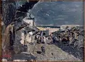 1869 | Mercado y casas | Óleo sobre madera 9 × 12,5 cm |