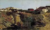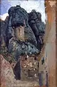 Antes de partir para su primer viaje a Italia con su esposa, cumplieron con la tradición catalana de visitar el monasterio de Montserrat. Fortuny aprovechó su estancia allí para realizar un par de paisajes de rincones de la montaña, en los que muestra edificios rústicos bajo los peñascos de la sierra, son bocetos rápidos donde se aprecian aún algunas zonas de la madera sin cubrir de pintura.[41] |
