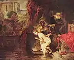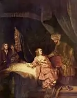 237 | ![]() | Joseph Accused by Potiphar’s Wife | 1655 | Oil on canvas | 110 x 87 | Gemäldegalerie, Berlin | With possible additions by another hand. The figure of Joseph and the left part of the pillow seem to have been added by a later hand on the basis of a rough underpainting by Rembrandt |