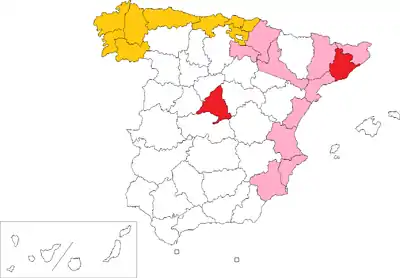 Áreas industriales en España. En rojo, áreas industriales desarrolladas (provincias de Barcelona y Madrid). En naranja, áreas y ejes en declive (eje atlántico: País Vasco, Cantabria, Asturias y Galicia). En rosa, áreas y ejes en expansión (eje del Ebro: Rioja, Navarra, norte de la provincia de Zaragoza y Cataluña; y eje mediterráneo, Cataluña, Comunidad Valenciana y Región de Murcia). El resto son áreas de industrialización inducida y escasa.[1] La distribución se asemeja a la de la implantación de la "economía del conocimiento".[2]