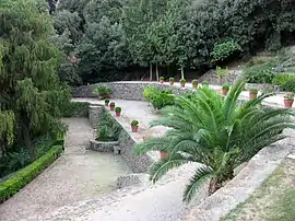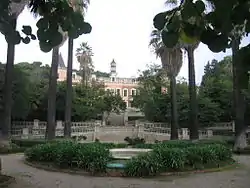 1894-1898 | Jardines del Palau de les Heures | 3,50 ha | Pº Valle de Hebrón, 171 (Horta-Guinardó) | El Palau de les Heures («palacio de las hiedras» en catalán) —también conocido como Casa Gallart— fue construido entre 1894 y 1898 por el arquitecto Augusto Font Carreras. Actualmente es sede de la Fundación Bosch i Gimpera de estudios universitarios de posgrado, y está integrado en el Campus de Mundet de la Universidad de Barcelona. Se trata de un edificio inspirado en la tipología del château francés, con la fachada presidida por una terracota con una alegoría de Las Hiedras de Josep Campeny. El palacio se encuentra en lo alto de un promontorio al que se accede a través de una serie de terrazas ajardinadas, con rampas y balaustradas elaboradas al estilo del jardín italiano renacentista. Los jardines, diseñados por Adrià Piera, se estructuran en cada nivel alrededor de unos estanques centrales con surtidores de agua, y en el espacio circundante se sitúan unos parterres de broderie rodeados de especies arbóreas como palmeras, magnolias y castaños de Indias. Hay también rosales y macetas de terracota con geranios. Los jardines fueron restaurados en 1999 por Patrizia Falcone y abiertos al público.[85] | ![]() |