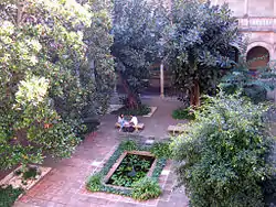 1917-1924 | Jardines de Laribal | 3,16 ha | Pº Santa Madrona, 2 (Sants-Montjuic) | Se encuentran en la montaña de Montjuic, y fueron realizados entre 1917 y 1924, con motivo de la Exposición Internacional de Barcelona de 1929. Fueron obra de Jean-Claude Nicolas Forestier y Nicolás María Rubió y Tudurí, que realizaron un conjunto de marcado carácter mediterráneo y gusto clasicista, con un estilo de inspiración hispanoárabe como el que Forestier había desarrollado en el Parque de María Luisa de Sevilla. Los jardines se estructuran a través de una serie de terrazas con pérgolas, plazoletas y fuentes, hasta desembocar en el Teatro Griego, un teatro al aire libre inspirado en los antiguos teatros griegos, proyectado por Ramon Reventós.[66] Los jardines albergan varios espacios singulares, como las escaleras del Generalife, que conectan los Jardines Laribal con los del Teatro Griego, diseñadas por Forestier con inspiración en el Generalife; la Font del Gat, una famosa fuente a cuyo lado el antiguo propietario, Josep Laribal, construyó una villa de estilo neoárabe, que actualmente es un restaurante; y la rosaleda de la Colla de l'Arròs, un patio ovalado rodeado de cipreses, debajo de una pérgola con pilares de terracota y una glorieta con una fuente en el centro y con distintas variedades de rosales. También se encuentran varias esculturas: Estival, de Jaume Otero (1929); Joven de la trenza, de Josep Viladomat (1928); y Reposo (1925), obra de Josep Viladomat sobre un original de Manolo Hugué. Dentro de los jardines se sitúa el Museo Etnológico de Barcelona, y en sus aledaños se encuentra la Fundación Joan Miró.[67] | ![]() |