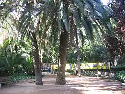 1898-1903 | Jardines del Palacio Robert | 0,39 ha | Paseo de Gracia, 107 (Ensanche) | El Palacio Robert se encuentra en la encrucijada entre el Paseo de Gracia y la Avenida Diagonal, dos de los principales ejes viarios de Barcelona. Se trata de un palacio de estilo neoclásico construido entre 1898 y 1903 con un proyecto del arquitecto francés Henri Grandpierre —aunque la construcción fue dirigida por Joan Martorell— para el financiero y político Robert Robert i Surís. El jardín fue diseñado por Ramón Oliva, autor del Campo del Moro en Madrid y el Parque del Campo Grande en Valladolid. Presenta tres grandes parterres, dos laterales y uno central, separados por caminos de sablón. Alberga diversas especies de escasa presencia en la ciudad, como el plátano de Levante, el ciprés de Arizona o el sauce mimbre amarillo. Muchas de las palmeras del jardín procedían de la Exposición Universal de Barcelona de 1888. En el jardín también se encuentra la escultura La Luna, de Kiku Mistu (2001). El edificio actualmente es propiedad de la Generalidad de Cataluña y acoge un centro cultural y una oficina de turismo. El jardín fue abierto al público en 1998.[86] | ![]() |