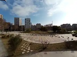 1988 | Parque de la Estación del Norte | 3,58 ha | C/ Almogávares, 27-61 (Ensanche) | Se encuentra en los terrenos aledaños a la estación de autobuses del mismo nombre, y fue creado en 1988 con un proyecto de Andreu Arriola, Carme Fiol y Enric Pericas. En 1999 fue ampliado por Patrizia Falcone. El parque se estructura en dos niveles: accediendo por la calle Lepanto se halla un nivel inferior donde se encuentran un área para perros y una zona de juegos infantiles, así como el Monumento a Juan Pablo Duarte, obra de Félix Tejada; tras pasar bajo un puente que cruza la calle Marina y subir una ligera pendiente se accede a una zona más elevada, que es la parte principal del parque, situada frente al edificio de la estación. Aquí destacan dos esculturas integradas con la naturaleza, al estilo del land-art: Cielo caído y Espiral arbolada, de Beverly Pepper. La primera parece una ola gigante que surge de la vegetación del parque, elaborada en cerámica de color azul con la técnica gaudiniana del trencadís; la segunda tiene forma de tronera de piedra, rodeada de tilos. La misma artista diseñó los elementos de iluminación del parque, unos monolitos de hierro de cuatro metros de altura; y también los bancos, elaborados con piedra artificial, y que parecen piezas de ajedrez. El resto del parque alterna zonas de césped con espacios arbolados, en los que destacan las acacias y los cipreses.[40] | ![]() |