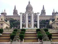 1970 | Jardines de Joan Maragall | 3,63 ha | Av. del Estadio, s/n (Sants-Montjuic) | Se encuentran en la montaña de Montjuic, entre el Estadio Olímpico y el Palacio Nacional. Se hallan alrededor del Palacio de Albéniz, residencia de la Familia Real Española durante sus visitas a la ciudad condal. El origen del jardín proviene de la Exposición Internacional de Barcelona (1929), fecha en la que se construyó el Pabellón Real, obra de Juan Moya, de estilo barroco inspirado en la arquitectura palaciega francesa del siglo XVIII. Junto a este se hallaba el Palacio de las Misiones, que fue derribado para la ampliación de los jardines en los años 1970, proyecto que corrió a cargo de Joaquim Maria Casamor, que diseñó un conjunto de estilo afrancesado, con abundante decoración escultórica. El jardín fue dedicado al poeta catalán Joan Maragall, en consonancia con otros jardines de la zona de Montjuic dedicados a poetas. Los jardines se organizan en tres zonas: una frente a la fachada principal del palacio, con dos estanques en cada extremo y una zona central de parterres, destacando en el extremo opuesto al palacio un templete con la escultura Susana en el baño, de Théophile-Eugène-Victor Barrau; otra en los laterales del palacio, que se corresponde con los antiguos jardines de 1929, donde destacan dos fuentes con tritones y dos esculturas tituladas Mujer recostada, de Enric Monjo; y la zona norte, que da al Palacio Nacional (sede del MNAC), donde destaca un patio peristilo con una columnata jónica, con la escultura Serena, de Pilar Francesch, y donde se sitúa la ermita de Santa Madrona.[59] | ![]() |