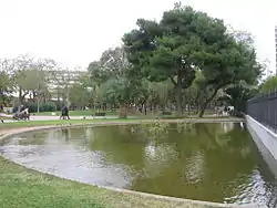 1979-1992 | Parque de Sant Martí | 6,80 ha | C/ Menorca, 64 (San Martín) | Este parque fue elaborado en distintas fases: en 1979 se iniciaron las obras con un proyecto original de Nicolás María Rubió y Tudurí, aunque a causa de su fallecimiento fue terminado por los arquitectos Antonio Armesto, Carles Martí y Miquel Sodupe, con una primera fase finalizada en 1985 y la segunda en 1992.[98] El parque se estructura en dos zonas: una plaza cuadrada enmarcada por las calles Menorca, Huelva, Trabajo y Agricultura, que supone una cuarta parte del total del parque; y el área de mayor extensión, que tiene forma de un triángulo irregular, dividida a su vez en una zona verde con un lago y un área perimetral en la vertiente de la calle de Menorca que acoge diversas instalaciones y equipamientos: un campo de fútbol, un mercado, un instituto de secundaria y la iglesia parroquial de San Martín de Provensals. En su terreno también se encuentran tres antiguas masías, Ca l'Arnó, Can Planas y Can Cadena, reconvertidas en espacios cívicos para los vecinos. El área junto al lago acoge amplias praderas con alisos, álamos temblones y chopos lombardos, que rememoran el pasado agrícola de la zona, mientras que el área con equipamientos está resuelta con espacios pavimentados y plazoletas con naranjos y olivos, que acogen además áreas de juegos infantiles y pistas deportivas.[99] | ![]() |