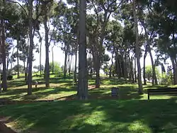 1947 | Parque de Monterols | 1,94 ha | C/ Muntaner, 426 (Sarriá-San Gervasio) | El parque, clasificado como forestal, se ubica un una colina llamada Turó de Monterols —también denominada a veces Turó d'en Gil—, de 127,3 msnm, perteneciente a las estribaciones del Tibidabo. El terreno era propiedad de la familia Gil, hasta que en 1940 el Ayuntamiento de Barcelona compró la finca. En 1947 se inauguró el parque, tras una remodelación efectuada por Lluís Riudor. La vegetación es de tipo mediterráneo, donde destacan los pinos y los algarrobos, así como robles, cipreses, encinas, olivos y almendros. En una pequeña hondonada que antiguamente fue una cantera hay palmitos y plantas aromáticas (romero, tomillo, espliego y salvia), así como especies arbustivas como el lentisco, el madroño, la retama y el avellano.[76] Los caminos son circulares y ascendentes, con escaleras en algunos tramos; en ocasiones se abren a pequeñas plazoletas donde se sitúan áreas infantiles o mesas de ping-pong. Cerca de la entrada de la calle Gualbes hay una fuente de piedra con un relieve de putti sosteniendo guirnaldas de flores y frutas, obra anónima proveniente quizá del taller de un picapedrero.[77] | ![]() |