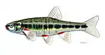 Phoxinus phoxinus | Piscardo NV: Pescardu[4], chamarru, moritu[cita requerida] | Todas | L: 10 cm. Omnívoro gregario de pequeño tamaño, suele desplazarse formando cardúmenes numerosos. De cuerpo alargado, y cabeza proporcionalmente grande, su coloración es variable en función de la época del año. Generalmente habitan en los tramos medios y altos de los ríos con aguas bien oxigenadas cuyas temperaturas se sitúan entre 2 °C y 20 °C. | ![]() | |