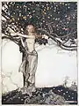 - Freia con sus manzanas doradas, y a sus pies sus dos gatos mágicos.