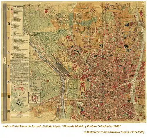 Plano de Madrid y pueblos colindantes al empezar el siglo XX | 1900 | Facundo Cañada | Fue realizado a escala 1/7.500, componiendo sus seis hojas una superficie total de 1,44 x 1,77 metros. Se trata del primer plano que representa no sólo la ciudad de Madrid sino el conjunto de localidades de su entorno a principios de siglo xx. |