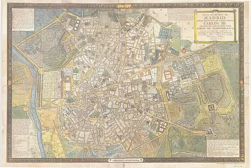 Plano geométrico de Madrid: dedicado y presentado al Rey Nuestro Señor Don Carlos III. Por mano del Excelentísimo señor conde de Floridablanca. | 1785 | Tomás López[3] | El autor señala algunos planos de Madrid anteriores, como él de Pedro Texeira (1604) o él de Espinosa de los Monteros.[4] |