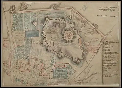 Plano del Retiro; y Fortificaciones que hicieron los Franceses en los años del 1808, 1809, 1810, 1811, 1812 y 1813 | 1813 (hacia) | La Rendición del Retiro tuvo lugar el 14 de agosto de 1812,[5] pocos días después de la entrada en Madrid del ejército anglo-portugués de Wellington.[6][7]A la izquierda del plano se ve la calle Alcalá, la puerta de Alcalá (K) y la plaza de toros de la Puerta de Alcalá (I). El edificio cuadrado (A), rodeado por las fortificaciones en forma de estrella (traza italiana) y un recinto con baluartes, es la Real Fábrica del Buen Retiro –popularmente conocida como «la China» por sus productos de porcelana– y ubicada en la actual glorieta del Ángel Caído y su monumento, la fuente del Ángel Caído.[8] El Real Observatorio de Madrid (B), está situado en el cerro de San Blas. En la parte inferior se ve el Real Jardín Botánico de Madrid (D) y, a su izquierda, el Museo del Prado (F). | |
