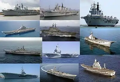 No se consideran como tal los portaviones de escolta, buques mercantes reconvertidos como pequeños portaviones, construidos por Reino Unido y por los Estados Unidos en la Segunda Guerra Mundial y usados por los citados países, Canadá y Francia. Tampoco aparecen los Submarinos portaviones, portahidroaviones o buques de asalto anfibio del tipo LHA, LHD o LPH.