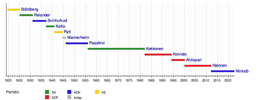 Sauli NiinistöTarja HalonenMartti AhtisaariMauno KoivistoUrho KekkonenJuho Kusti PaasikiviCarl Gustaf Emil MannerheimRisto Heikki RytiKyösti KallioPehr Evind SvinhufvudLauri Kristian RelanderKaarlo Juho Ståhlberg