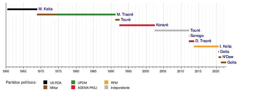 El primer presidente fue Modibo Keïta que asumió los poderes de jefe de estado y de gobierno, estableció el unipartidismo (sólo era legal la Unión Sudanesa-Movimiento Democrático Africano) y persiguió a la oposición. En 1967 suspendió la constitución y creó Comité Nacional de Defensa de la Revolución. Sin embargo el 19 de noviembre de 1968 el lugarteniente Moussa Traoré organizó un golpe de Estado y derrocó a Keïta, a quien envió a la prisión de Kidal, en el norte del país. Traoré ejerció la jefatura de estado de su país entre 1968 y 1991, instaurando un represivo régimen militar, que posteriormente devino en una dictadura de partido único, que duró más de dos décadas. Poco después de tomar el poder, todas las actividades políticas fueron prohibidas. Se instaura un régimen militar bajo la dirección del capitán Tiécoro Bagayolo.