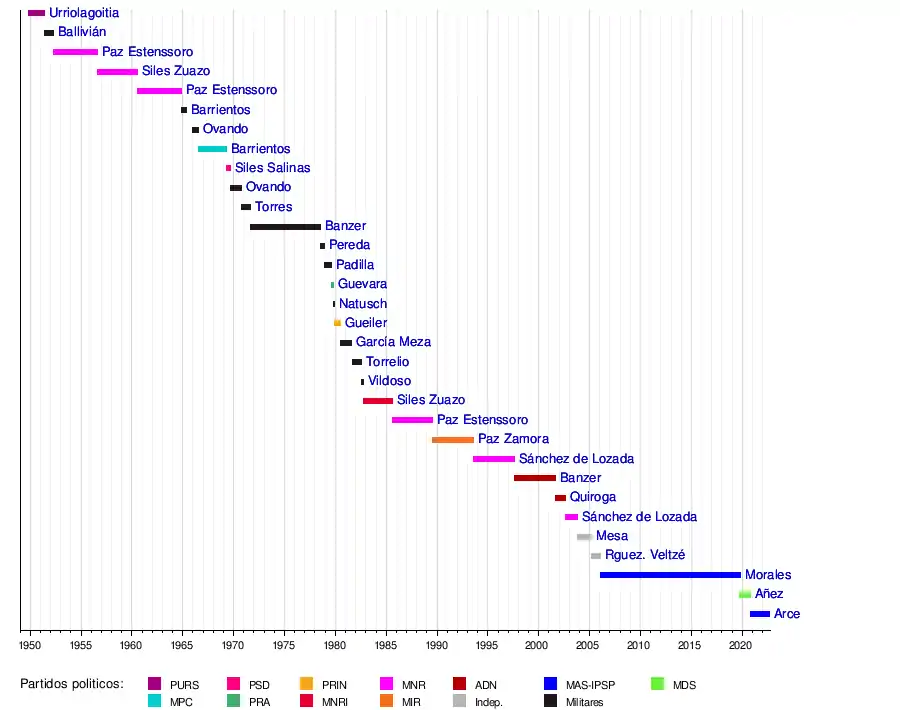 En los 90 gobiernos que ha tenido el país desde su fundación el 6 de agosto de 1825, 67 ciudadanos han ejercido el cargo de presidente de Bolivia. Cabe mencionar que en la actualidad, se han abierto discrepancias entre algunos historiadores como lo es Isaac Sandoval Rodríguez, sobre si Bolívar fue el primero en ocupar dicha cartera de Estado.[1] Se menciona que Antonio José de Sucre fue el primer presidente de Bolívar,[2] ya que se piensa que Simón Bolívar fue el primer mandatario, lo que también aborda el historiador Carlos Mesa.[3] Esto llevó a historiadores como el mencionado Sandoval,[4] quien afirma que Sucre fue el primero en ocupar dicho cargo y que Bolívar fue gobernante y protector de la República, título otorgado por la Asamblea Deliberante el 10 de agosto de 1825.[5]