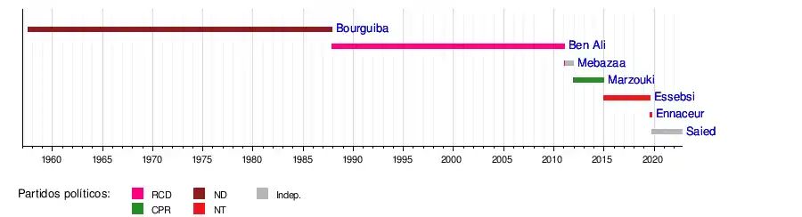 25 de julio de 1957 | 7 de noviembre de 1987 | Neo-Destour | 30 años, 3 meses y 13 días | 1959 1964 1969 1974 |