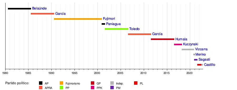 Partido político: Independiente Militar Partido Civil Partido Demócrata Partido Constitucional Partido Democrático Reformista Unión Revolucionaria Coalición Conservadora Frente Democrático Nacional Unión Nacional Odriista Movimiento Democrático Peruano Acción Popular Alianza Popular Revolucionaria Americana Fujimorismo Perú Posible Gana Perú Peruanos Por el Kambio Partido Morado Perú Libre