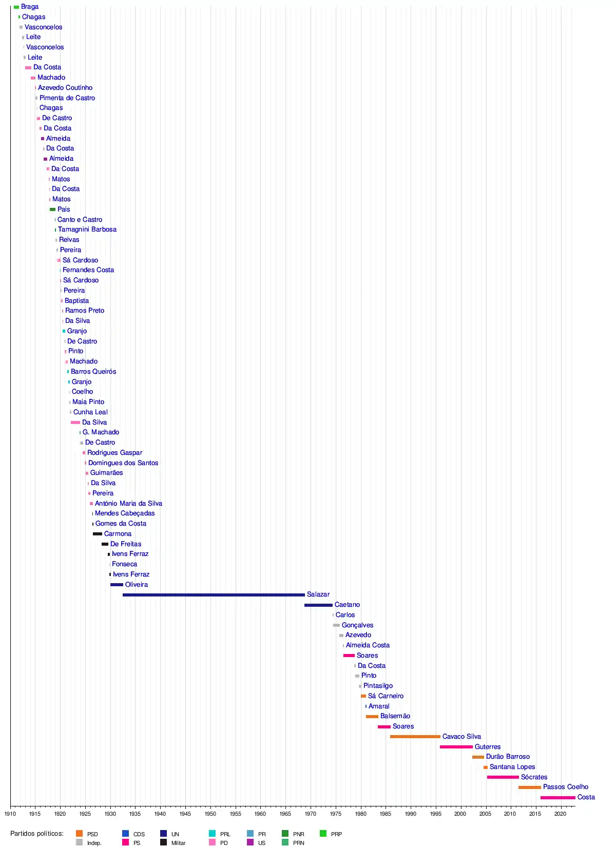 En 1926 el golpe de estado del 28 de mayo liquida el régimen parlamentario y establece una dictadura (Segunda República Portuguesa) que acabará en el régimen salazarista, Estado Novo, en 1933. El jefe del gobierno portugués mantendrá la denominación de 1910.