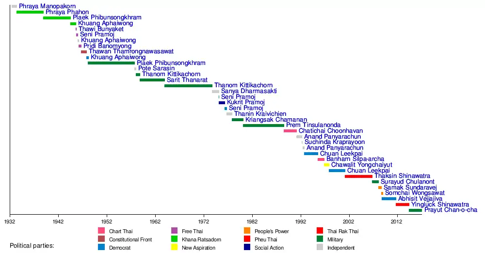 - Gabinete de Tailandia (2010). «History of Thai Prime Ministers» (en inglés). Cabinet.thaigov.go.th. Consultado el 5 de julio de 2013.