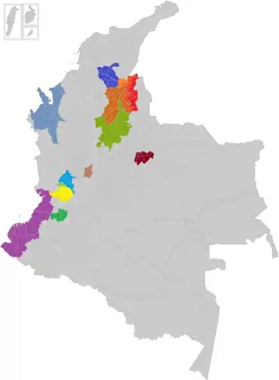 Caro Céspedes Depresión Momposina Magdalena Medio Norte del Cauca Norte del Valle del Cauca Pacífico Sur Sugamuxi Sur-Caribe Urabá |