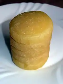 Chhena | Queso fresco sin madurar realizado con leche de búfalo de agua. Tiene forma húmeda y desmenuzable como el farmer cheese o el paneer, y se utilizada para hacer postres tales como la rasagula. |