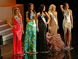 Finalistas de Miss Universo 2006, de izq. a der.: Lauriane Gilliéron, Miss Suiza; Lourdes Arévalos, Miss Paraguay; Kurara Chibana, Miss Japón; Tara Conner, Miss Estados Unidos; y Zuleyka Rivera, Miss Puerto Rico (ganadora).