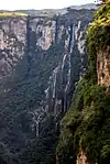 14 | Saltos Gêmeas Gigantes | 210 (450) | cañón Malacara | ![]() ![]() | Localizada en el cañón Malacara, los saltos conocidos como Gemelas Gigantes están situados en el paredón norte del cañón. Los saltos forman parte de una secuencia de caídas que supera los 450 m de altura total, aún no medida oficialmente. | |