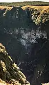![]() | 25 | Cachoeira do Tigre Preto | ~190 | cañón Fortaleza | ![]() ![]() | Localizada en el cañón Fortaleza, la cascada no es la más alta de las caídas de agua de este cañón, pero es la más caudalosa y la más visitada. Se compone de tres segmentos yuxtapuestos en los que el curso del río hace una rotación de 90° a la derecha. Cerca de 400 metros bajo la cascada, en el lugar donde la garganta del río Tigre Negro alcanza el canal principal del cañón, hay un salto más de unos 150 m de altura. |